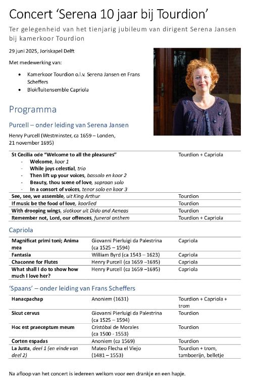 Serena Jansen is al weer tien jaar de dirigent van Tourdion. Dat heuglijke feit wilden we niet ongemerkt voorbij laten gaan. Daarom vond op 29 juni 2025 in de Joriskapel een intiem concert plaats om dit te vieren.